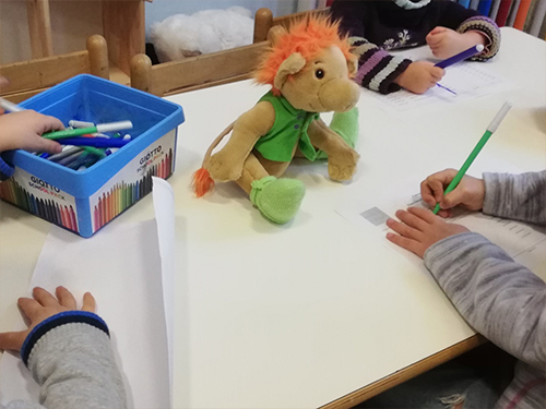 Quello che abbiamo scoperto frequentando le maestre delle Scuole dell’Infanzia del Comune di Genova è che vanno sempre a scuola per formarsi su qualcosa di nuovo, si aggiornando di continuo e poi applicano con grande impegno e passione. Dal Laboratorio di formazione sulla narrazione tenuto da Officina Letteraria sono uscite molte storie che le maestre hanno scritto per i loro bambini scegliendo parole e immagini. Ecco un esempio. — Leo di casa in casa. La pioggia ticchetta sulla finestra, grosse gocce scendono lentamente lungo i vetri, grosse lacrime scendono dalle guance della maestra. “Maledetta cipolla!”. La maestra dondola ritmicamente al suono della mezzaluna che batte sul tagliere, a tratti si asciuga gli occhi con la manica sinistra. “Maledetta cipolla!”. La maestra, mentre sminuzza le verdure per il soffritto del ragù pensa ai suoi bambini che, in mattinata a scuola hanno costruito un razzo per arrivare sulla luna e tornare a terra in tempo per il secondo turno del pranzo. “Ci siamo divertiti! ” pensa. Un rumore ovattato, uno “stump, stump” attira la sua attenzione, abbandona la mezzaluna sul lavandino… “Marco sei tu? o ha bussato qualcuno?” Marco con le cuffie in testa si muove per la stanza ad un ritmo che solo lui riesce a sentire. “Stump, stump!”, “Ma da dove viene questo rumore?” Lo sguardo della maestra inizia a viaggiare per la cucina e prosegue per tutta al casa… Un’ombra, una forma sconosciuta dietro il vetro della portafinestra del terrazzo attira la sua attenzione. C’è qualcuno là fuori, alla pioggia e al vento, qualcuno che la maestra non conosce. Apre la porta, uno scroscio di pioggia entra di prepotenza fermandosi sullo scalino: appena fuori, un piccolo personaggio con criniera e ciuffo della coda arancione, gilet e calze verdi, un grosso nasone su cui brillavano due piccoli occhi neri come il carbone, bagnato anzi inzuppato di pioggia, la osservava dal basso all’alto. “Ma tu da dove vieni?”, “Giuseppeee!” (il gabbiano reale amico della maestra che racconta storie che solo chi possiede le ali può conoscere)…”sei tu che mi hai portato questo Piccolino?” Alla domanda risponde solo lo scrosciare della pioggia, nel cielo più grigio del porfido solo nuvole pesanti di pioggia. La maestra accoglie Piccolo, gli prepara un bagno caldo, lo asciuga… “Il soffritto può aspettare e poi non ho voglia di cucinare.” Piccolo tace o forse non conosce la lingua della maestra, ma ormai il senso del dovere le impone di preparare la cena. Piccolo la segue con lo sguardo e lei se lo porta appresso. “Le verdure nel wok sono pronte, vieni che andiamo a scegliere i libri da leggere ai miei bambini a scuola.” Il cielo ha smesso di piangere mentre le ombre della notte avanzano sui tetti della città. Le ultime nuvole si dissolvono scoprendo un cielo illuminato dalla facciona della luna che sorride mostrando tutti i denti del Mare della Tranquillità. Piccolo, scalando la grande Stella di Natale, riesce a raggiungere il davanzale della finestra e non distoglie lo sguardo dal satellite terrestre. Il giorno dopo, nevica. La maestra accompagna i bambini in giardino che con la bocca aperta e la lingua di fuori rincorrono i piccoli fiocchi di neve. Al rientro a casa: “Ti sei annoiato Piccolo? Hai visto la neve? Vieni sul terrazzo. Guarda è bianca, è fredda, presto che si scioglie!” Piccolo sa ascoltare e la maestra gli racconta dei giochi, delle storie, delle facce sorridenti e imbronciate dei suoi bambini, delle risate e dei pianti, dei nasi moccicosi, delle voci che riempiono la testa e il cuore… La mattina successiva, sveglia alle 6.30. La scuola aspetta la maestra per aprire il suo portone verde. “Devo sbrigarmi, Piccolo. Che fai qui dalla porta? Vuoi venire anche tu? Ora non posso, ma ti prometto che domani ti porto con me.” In classe la mattinata trascorre in fretta con il racconto di Piccolo e del suo strano ritrovamento, della sua voglia di venire a scuola, della promessa di portarlo, domani, a conoscere ai bambini. Il pomeriggio in casa della maestra è denso di preparativi. “Piccolo prova ad entrare nella valigia, ci stai? Devo preparare la busta per le foto, forse un quadernino dove scrivere, disegnare… le proprie emozioni.” Trillo della sveglia, sono le 6.30 del grande giorno. Piccolo è già prontissimo. “Andiamo, i bambini ti aspettano.”